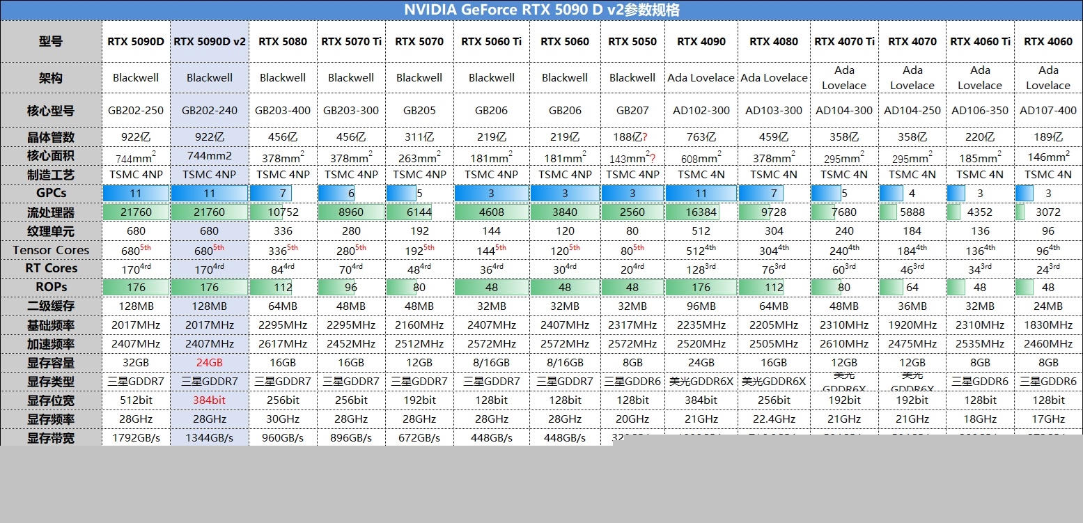 至于其他参数,RTX 5090 D v2拥有11组GPC共21760个流处理器、680个Tensor Core、170个RT Core和192个ROP单元,128MB二级缓存,这些与RTX 5090 D v2完全一样。