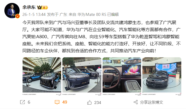 快科技1月5日消息,刚刚,余承东发布微博称,今天他带队来到广汽与冯兴亚董事长及团队交流共建鸿蒙生态,也参观了广汽展厅。