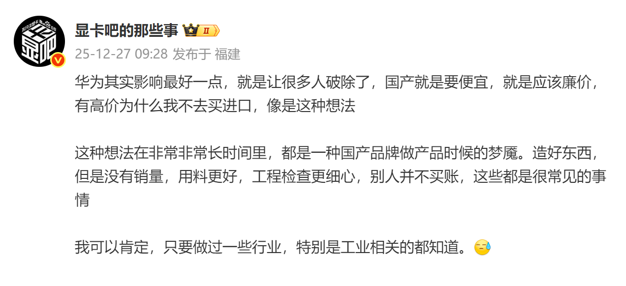 帖子中写道:“”华为其实影响最好一点,就是让很多人破除了,国产就是要便宜,就是应该廉价,有高价为什么我不去买进口,像是这种想法。