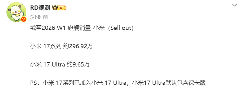 快科技1月11日消息,博主“RD观测”发布了2026年第一周的小米旗舰机型销量数据,数据显示小米17系列总销量约达296.92万,小米17 Ultra(默认包含徕卡版)单款销量约9.65万。