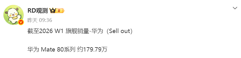 在小米17系列延续市场热度的同时,2026年第一周同期其他国产旗舰机型的销量也随之出炉,一加品牌里,一加15销量约27.45万,一加 Ace 6销量达34.41万,一加Ace 6T销量则约21.37万,华为Mate 80系列也在该周拿下了约179.79万的销量。
