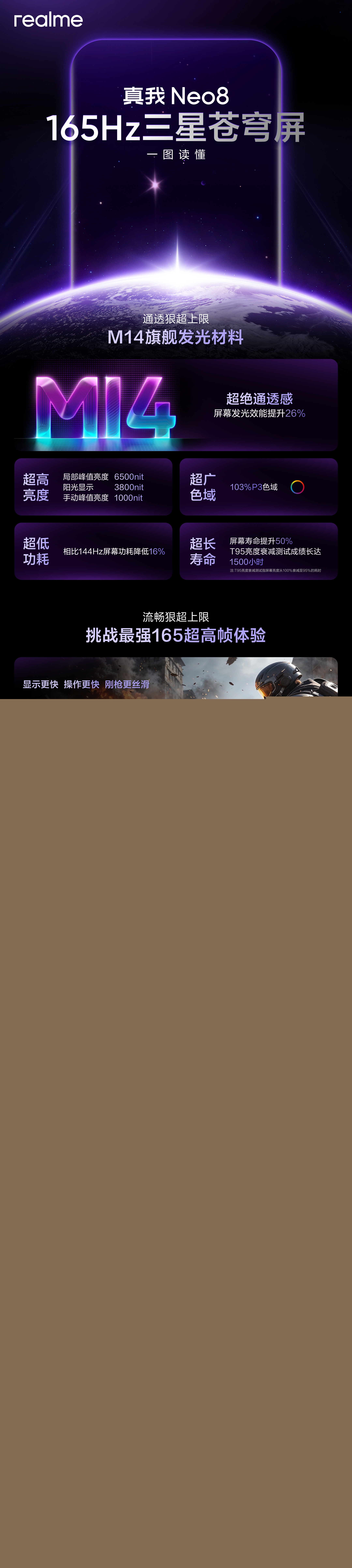 据悉,165Hz三星苍穹屏由真我Neo8首发搭载,这块屏幕采用最新的M14旗舰发光材料,屏幕发光效能提升26%,局部峰值亮度6500nit,支持3800nit阳光显示,手动峰值亮度1000nit。