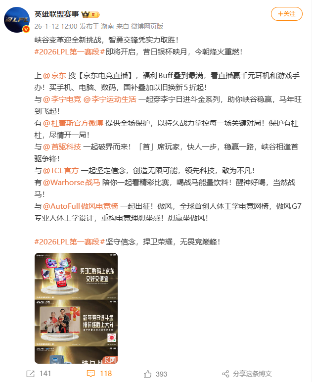 快科技1月12日消息,英雄联盟赛事官方微博今日公布了2026年LPL第一赛段赞助商名单。