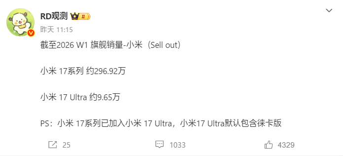 根据博主“RD观测”公布的销量数据,小米17系列包含Ultra和徕卡版的整体销量已经突破300万。