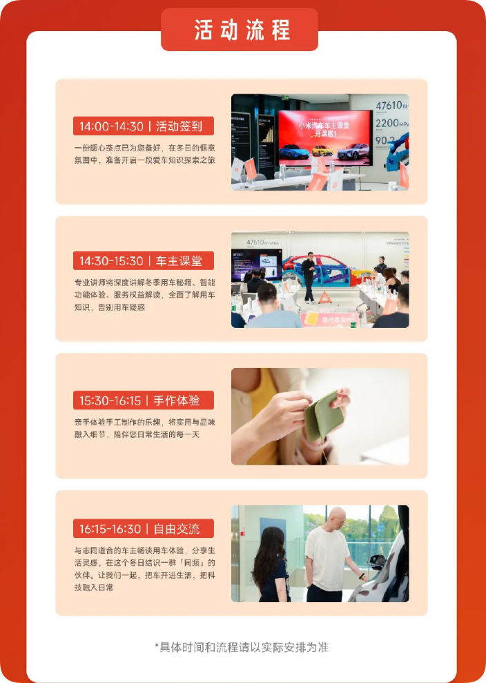 14:30——15:30为“车主课堂”,由专业讲师深入讲解冬季用车技巧、服务权益解读等内容,帮助用户全面了解车辆使用知识;