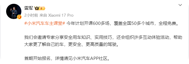 快科技1月14日消息,今日,小米创办人、董事长兼CEO雷军在微博发文表示,小米汽车车主课堂今年计划开课600多场,覆盖全国50多个城市,全程免费。