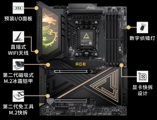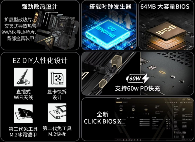 此外,产品还集成了显卡快拆按键、第二代免工具M.2冰霜铠甲、直插式WiFi天线等便捷设计,大幅提升装机与维护效率。配合全新的CLICK BIOS X图形化界面以及支持60W PD快充的后置接口,进一步增强了使用的便利性。