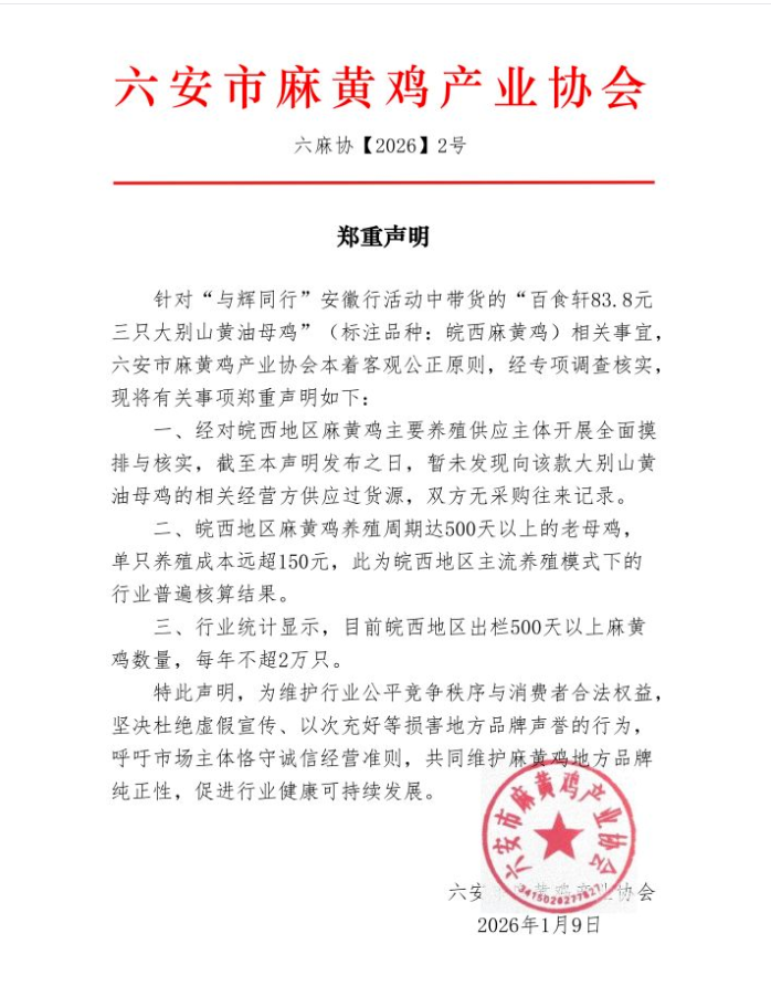 安徽省六安市麻黄鸡产业协会就此发布《郑重声明》,对相关产品的来源和成本提出疑问。