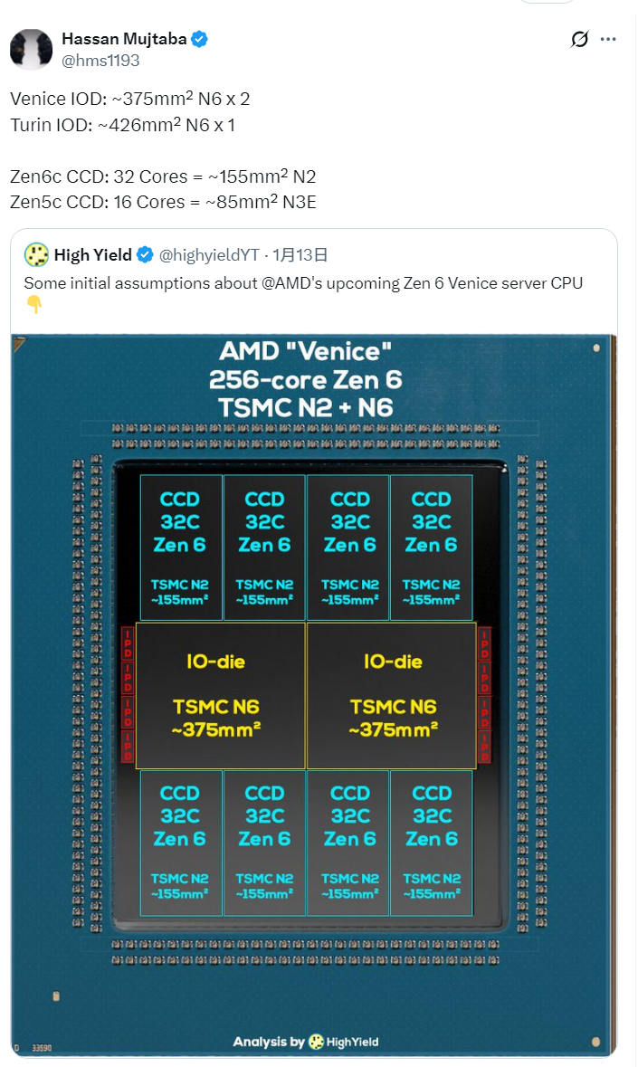 值得注意的是,EPYC Venice改用了双IO Die架构,两颗IO Die的总面积达750mm²,远超前代的单一IO Die设计。