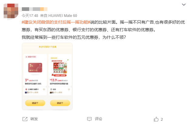 建议关闭微信支付后摇一摇功能上热搜 网友:每次都能薅到羊毛 为啥要关闭