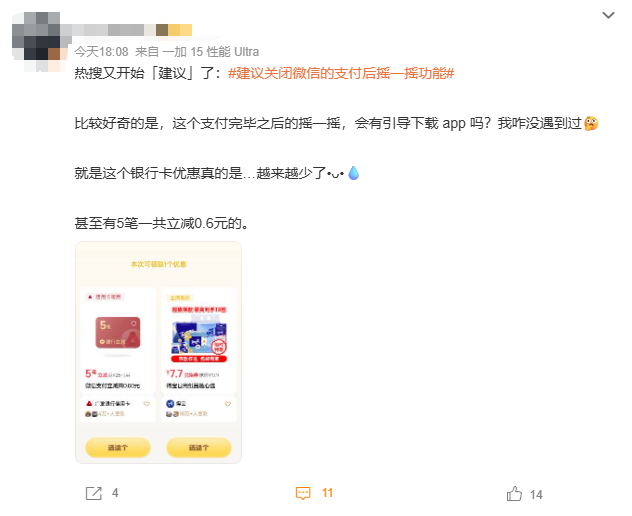 快科技1月14日消息,今日,词条“建议关闭微信的支付后摇一摇功能”登上微博热搜,引发网友热议。