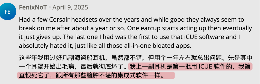 还有海盗船的 iCUE,有网友吐槽自己只是为了看一眼耳机电量,就非得装这么大一软件。有人说 iCUE 跑了 24 小时后,内存占用飙到了 24GB,系统直接卡死。