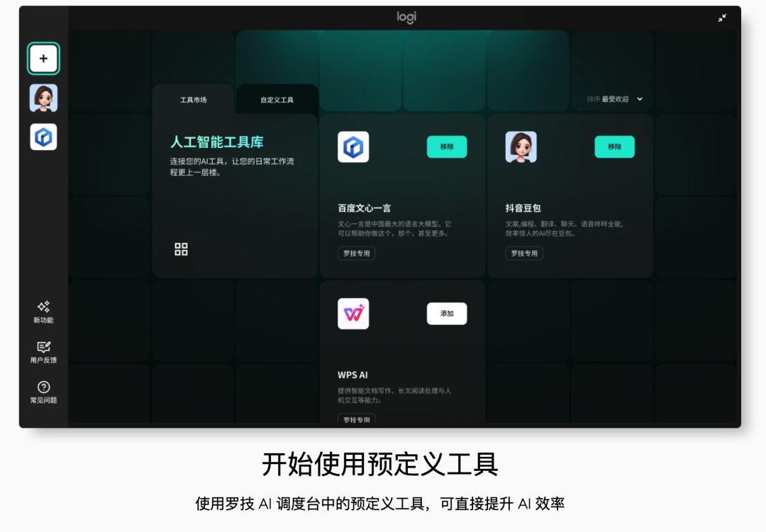 还有罗技 AI 调度台,整合了豆包、DeepSeek 各家 AI 助手。
