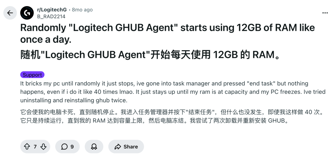 1G 算好的,有 Reddit 网友说 GHUB 每天都会让自己电脑卡死,运存占用 12GB,哪怕卸载重新安装也没用。
