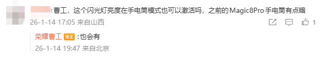还有网友询问称:“这个闪光灯亮度在手电筒模式也可以激活吗,之前的Magic8 Pro手电筒有点暗。”曹合浦回复称:“也会有。”