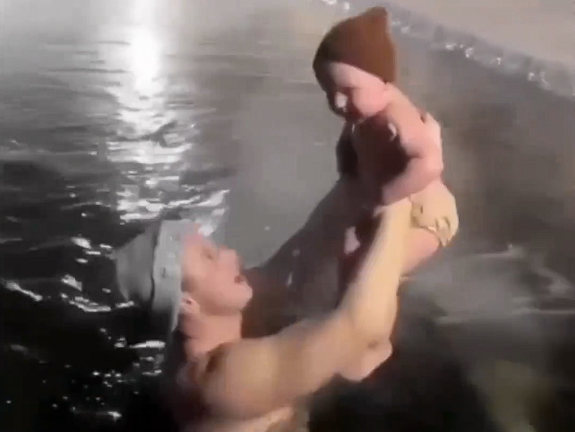 战斗民族日常!-30℃环境里俄罗斯男子把1岁儿子3次浸入冰水