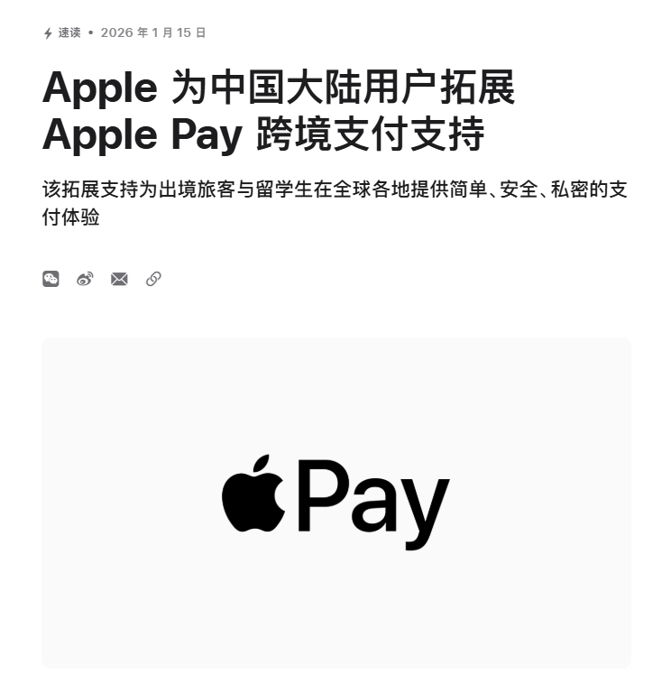 今日,苹果宣布拓展Apple Pay跨境支付支持,中国大陆Apple Pay终于支持绑定Visa信用卡、借记卡,国行iPhone用户出境也能使用NFC支付了。