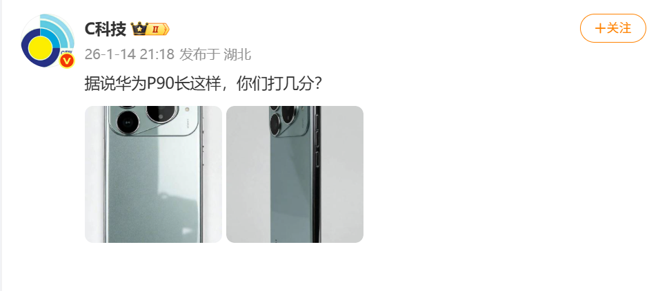 快科技1月15日消息,博主“C科技”发文分享了一组华为Pura 90的渲染图,该机型采用的是三角形镜头嵌入矩形平台的背部设计,不过该博主随后在评论区补充表示,自己也“不确定这组渲染图的真假”。
