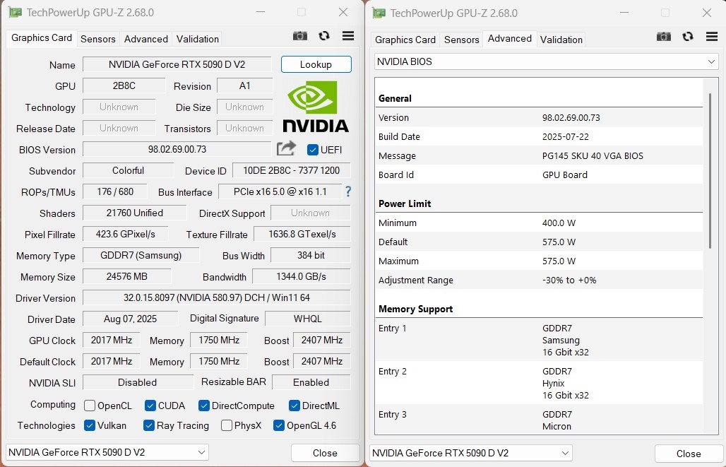 从上表可以看出,除了显存之外,RTX 5090 v2与RTX 5090 D没有任何差别,甚至连价格都一样…..