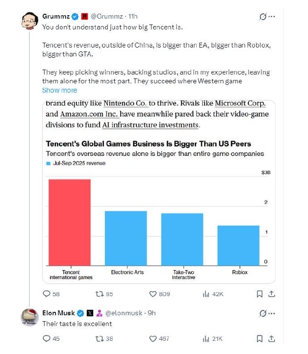他指出:“很多人并不真正了解腾讯的规模。仅在中国市场以外,腾讯的收入就已超过艺电、Roblox 甚至《GTA》系列的表现。”