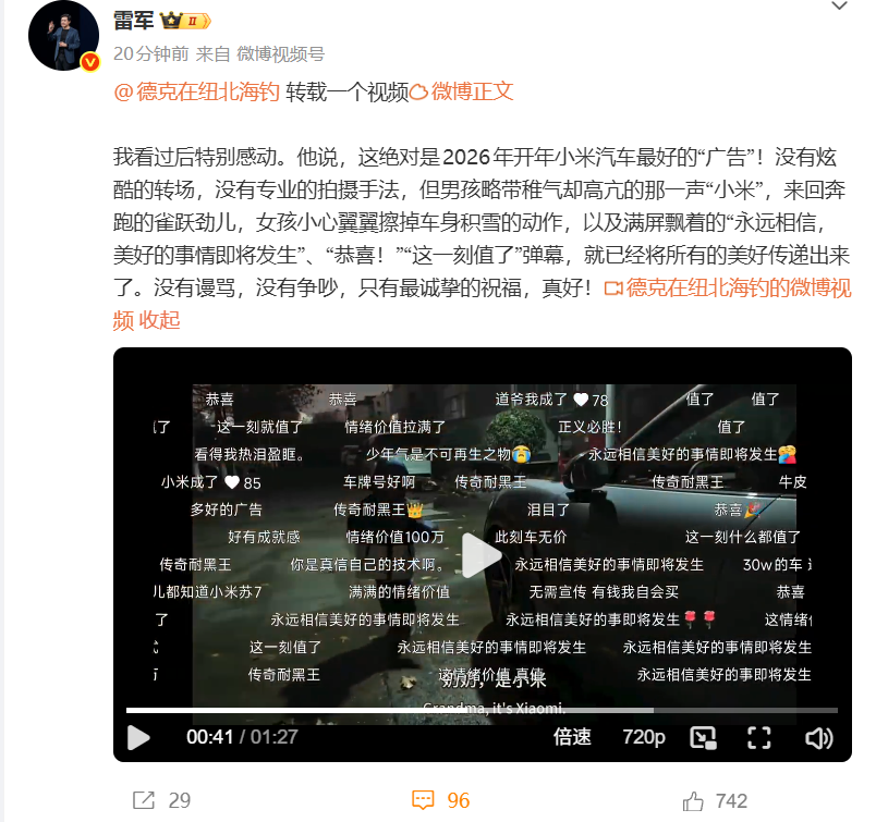 我看过后特别感动。他说,这绝对是2026年开年小米汽车最好的“广告”!没有炫酷的转场,没有专业的拍摄手法,但男孩略带稚气却高亢的那一声“小米”,来回奔跑的雀跃劲儿,女孩小心翼翼擦掉车身积雪的动作,以及满屏飘着的“永远相信,美好的事情即将发生”、“恭喜!”“这一刻值了”弹幕,就已经将所有的美好传递出来了。没有谩骂,没有争吵,只有最诚挚的祝福,真好!