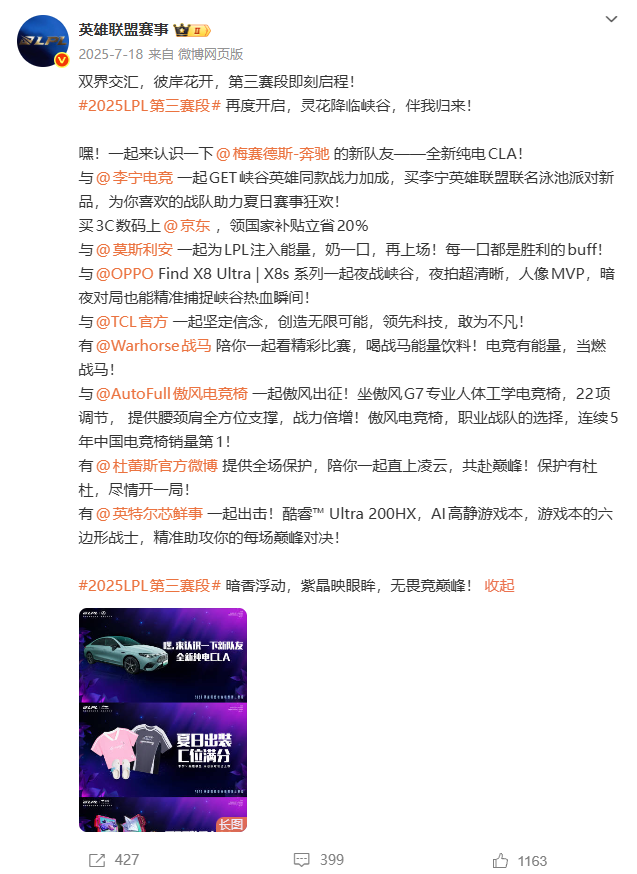 与2025年LPL夏季赛第三赛段相比,梅赛德斯-奔驰、英特尔、OPPO、莫斯利安等多家长期合作品牌未出现在本次名单中。