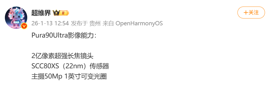 快科技1月13日消息,博主“超维界 ”发文曝光了华为Pura 90 Ultra的影像配置信息,该机后置2亿像素超强长焦镜头,采用SCC80XS(22nm)传感器,主摄为50Mp 1英寸可变光圈。