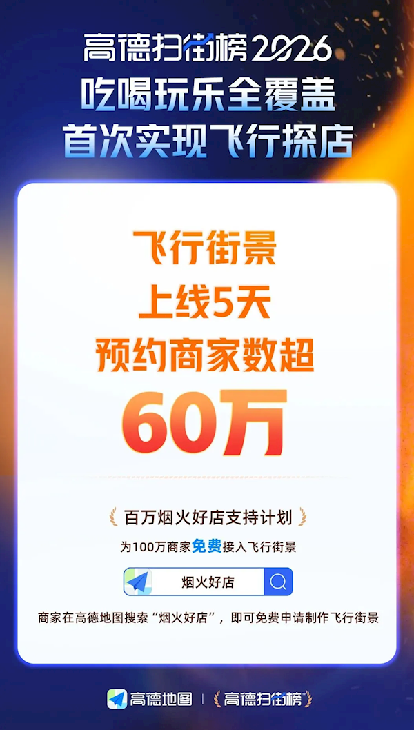 快科技1月13日消息,高德地图全新推出的“飞行街景”功能,上线仅5天,预约商家数量突破60万。