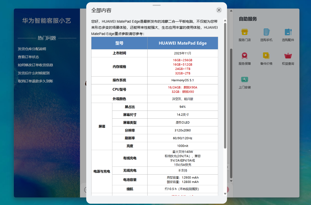 据华为客服提供的配置信息,华为MatePad Edge 16GB和24GB内存版本搭载麒麟X90A芯片,32GB版本则升级为麒麟X90芯片。