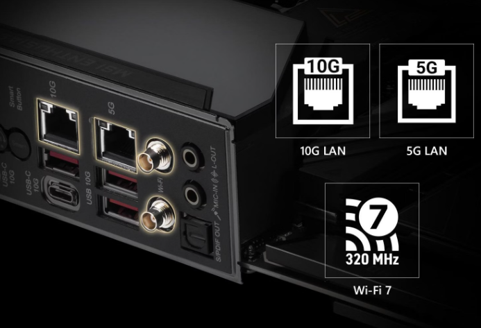 扩展能力上,主板提供5个M.2接口与3条PCIe 5.0插槽,为高速存储与下一代显卡留出充足升级空间,网络连接则配备万兆+5G双有线网卡与WiFi 7无线网卡,实现有线无线双高速通道,满足高带宽、低延迟的网络需求。