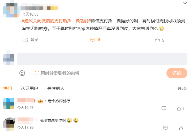 此外,笔者在多次使用微信支付后“摇一摇”领券功能的过程中,也未遇到博主所提及的自动下载App或跳转购物软件的情况。