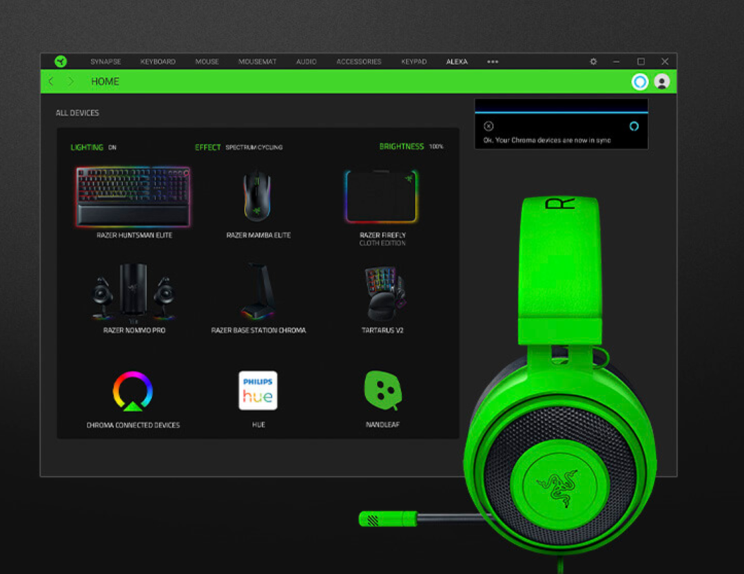 雷蛇家的外设配置工具叫 Synapse,占用空间 500MB 起步。骚的是它还内置了 Alexa 语音助手,你可以用耳麦对着电脑喊“Alexa,把灯调成绿色”。