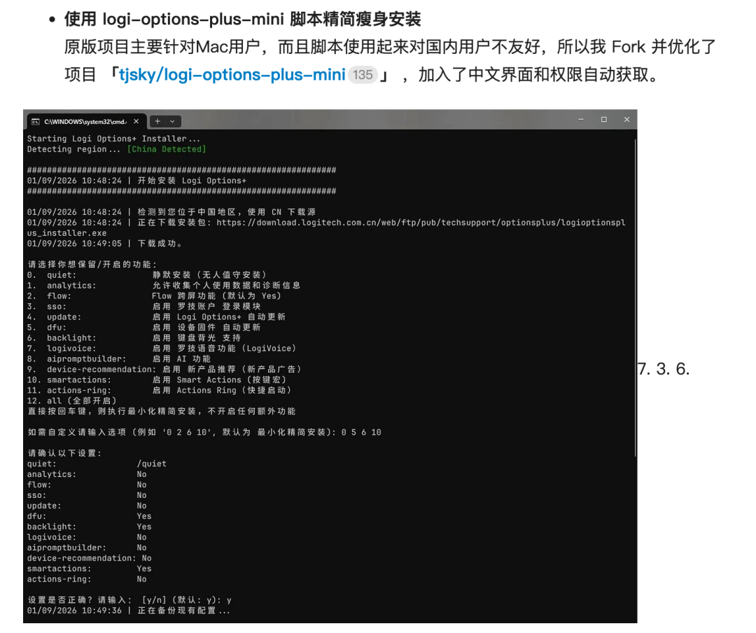 因为实在过于臃肿,还有人做出了精简版罗技 options+,利用脚本只安装纯净的驱动,剔除 AI、分析、广告等垃圾组件。