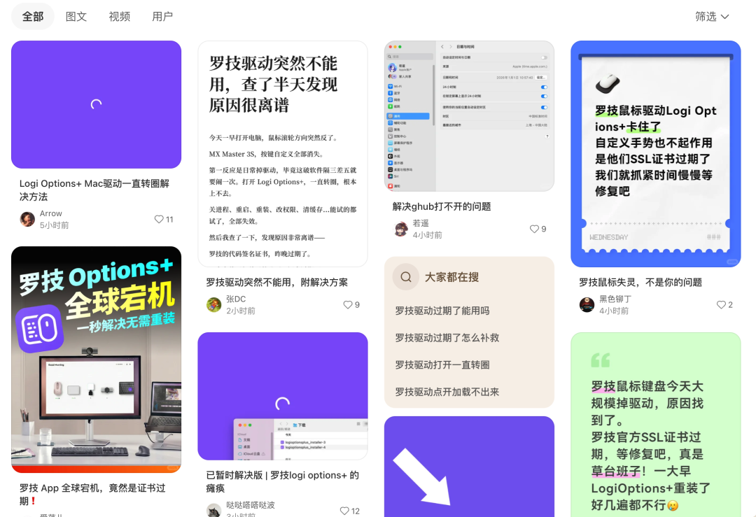 在小红书上,罗技 G-HUB、罗技 options(+)一直转圈进不去的帖子刷都刷不完。