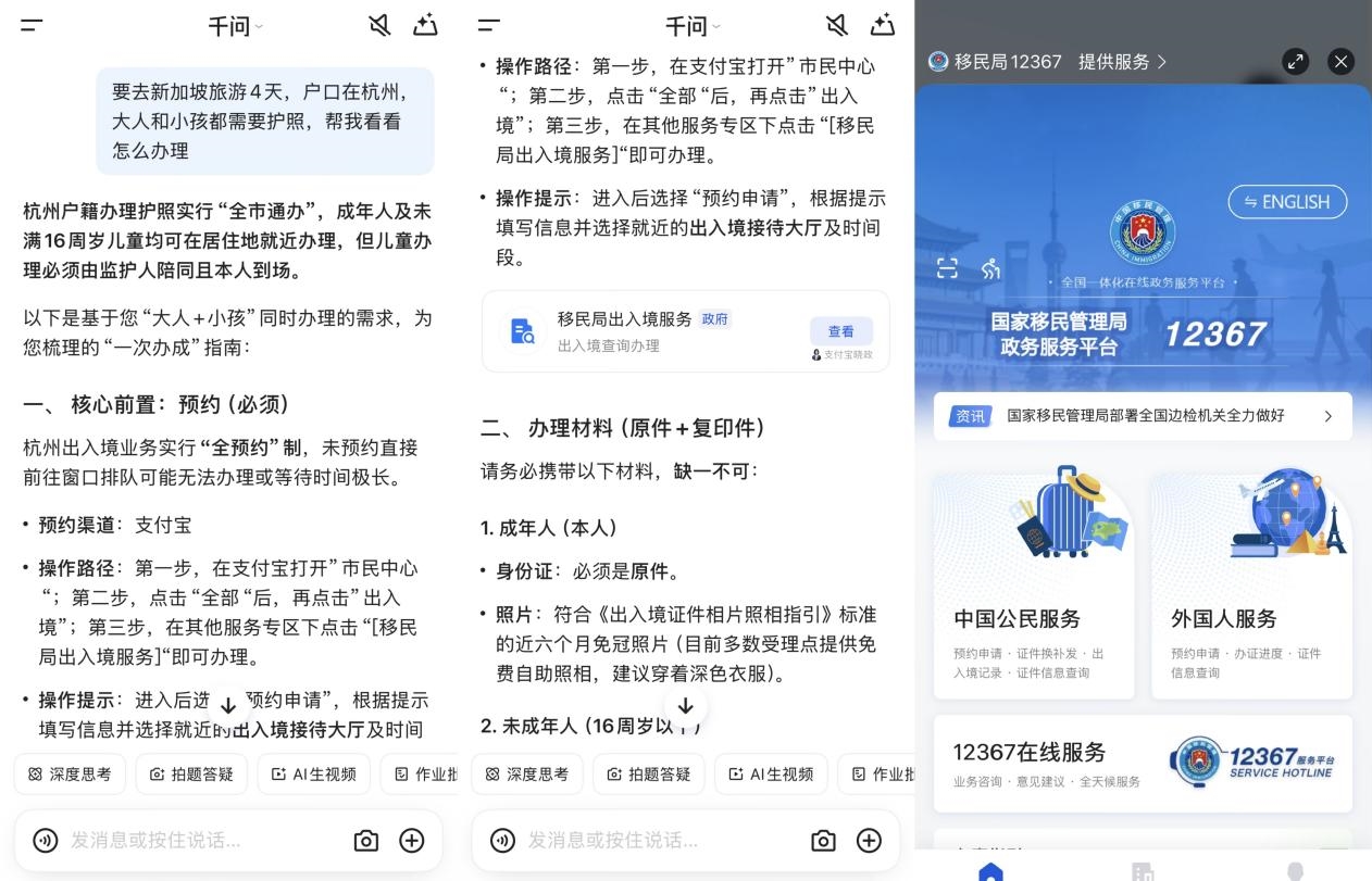 用户不再需要像过去那样在不同部门网站间奔波,只需一句“杭州户口怎么办护照”,千问即可完成政策解读、材料清单梳理,并直达办理入口。